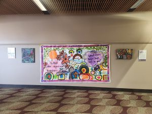 The large banner displayed was created during the First Friday Art Walk. As participants took in the current exhibition, they were asked what happiness looked like to them in color or image.