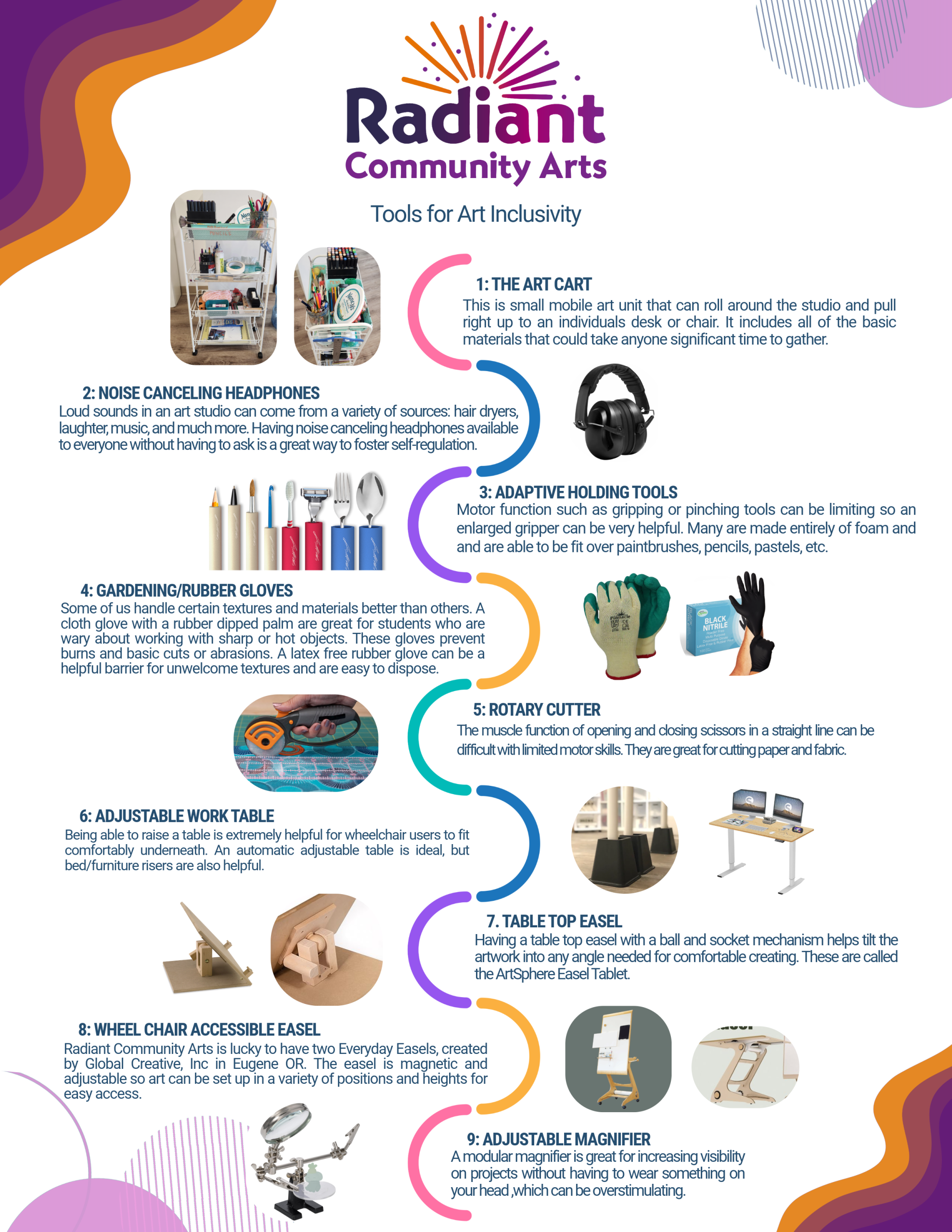 In the fall of 2025 Radiant Community Arts Participated in the Oregon Arts Educator Conference in Eugene, Oregon. Alongside MECCA we had participants create a mixed-media piece of artwork out of recycled materials. The only catch was each group was given a different impairment that represents what many of our students deal with on a daily basis. Many commented on how much more difficult it made their creation process, now imagine if you cant take off your disability at the end of the lesson?